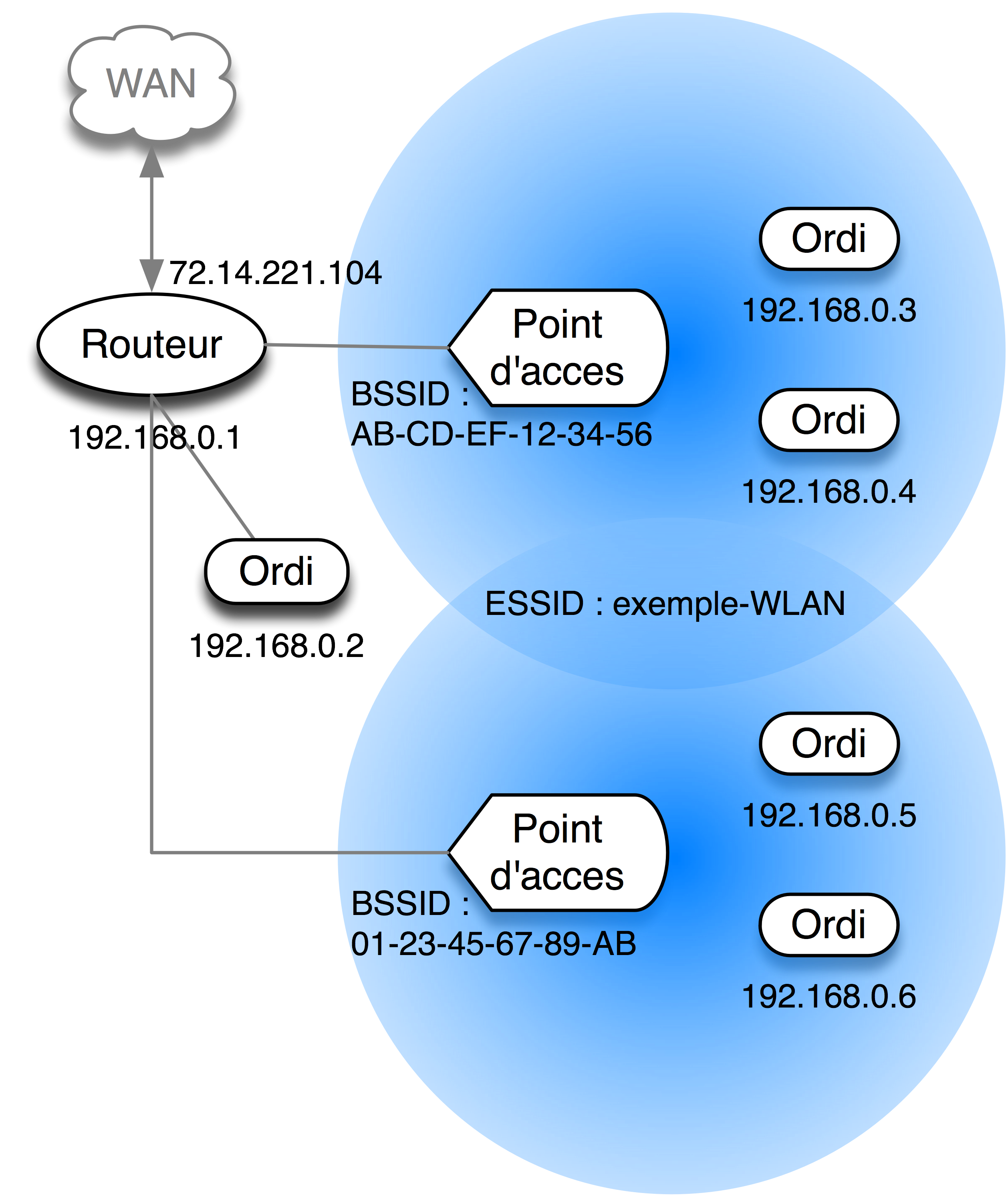 Il est identifié par un SSID comme lest un ESS en mode infrastructure. Cela signifie que.