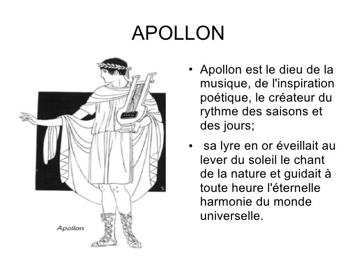 Son symbole est la lyre. Il est le musicien qui apporte la gaieté sur le mont Olympe quand il joue de sa lyre dorée. LA MUSIQUE ART DES MUSESDans le panthéon grec la musique est associée à différentes divinités parmi lesquelles Apollon dieu de la divination et de linspiration poétique tient une place à part.